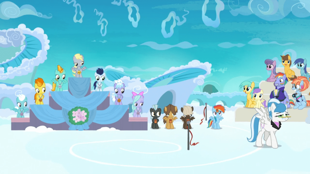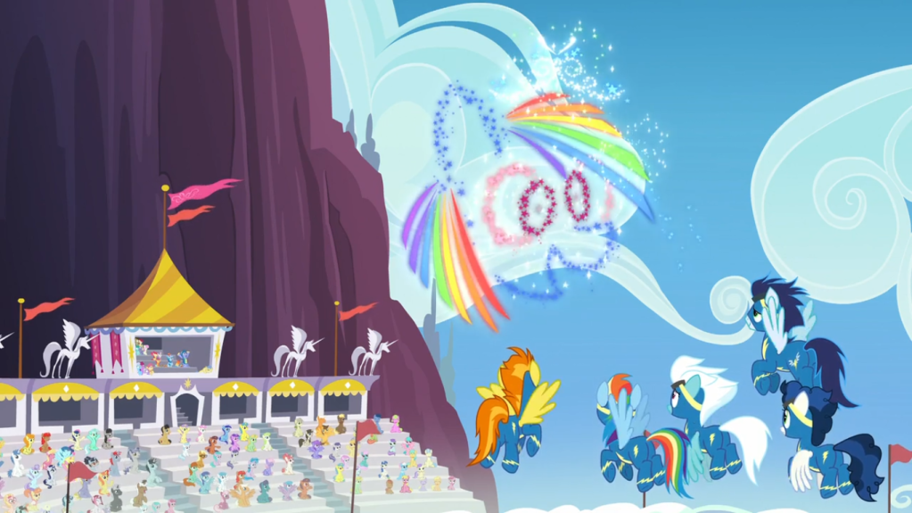Rainbow Dash reveals she brought her parents and Scootaloo over for a private Wonderbolts event, intended to show her love and gratitude for her parents and apologize for lashing out. I find it heartwarming that her fellow Wonderbolts came through to help her out with the event. All Spitfire says is “happy to help”, which shows the Wonderbolts sticking to their foundational principle of loyalty.