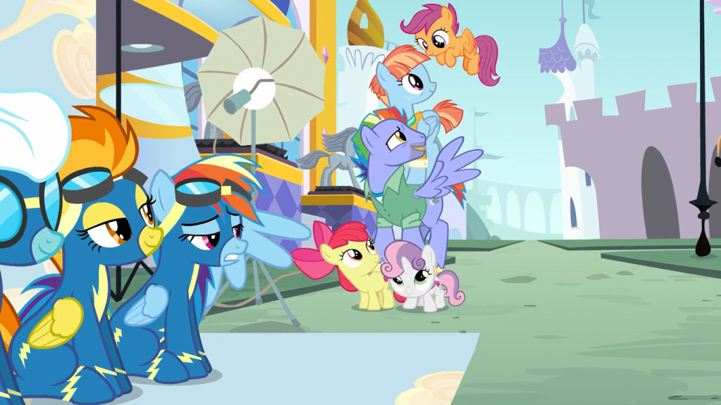 Scootaloo speaks for viewers when she knows nothing about Rainbow Dash’s childhood. This episode serves to fill this gap in the show’s lore, which is common in the late seasons. We’ve seen a few flashbacks of Rainbow Dash in flight camp, but otherwise we didn’t know much about her upbringing. It’s interesting that Scootaloo is the one learning about her childhood, almost like Scootaloo is learning something new about her own family. Again, this tells us a lot about Rainbow Dash’s distant relationship with her parents.