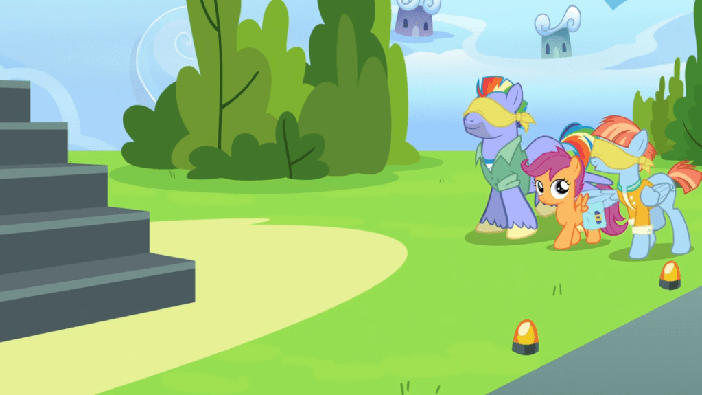 Compared to the last two episodes, this one has a very efficient cold opening. First, the Cutie Mark Crusaders set up a crazy scooter slingshot to send Scootaloo to Cloudsdale, but right as she’s about to be launched, she realizes she could have used something safer like a hot air balloon. Doing something overly ambitious when they could have used a quick and safe alternative is the essence of the Cutie Mark Crusaders.