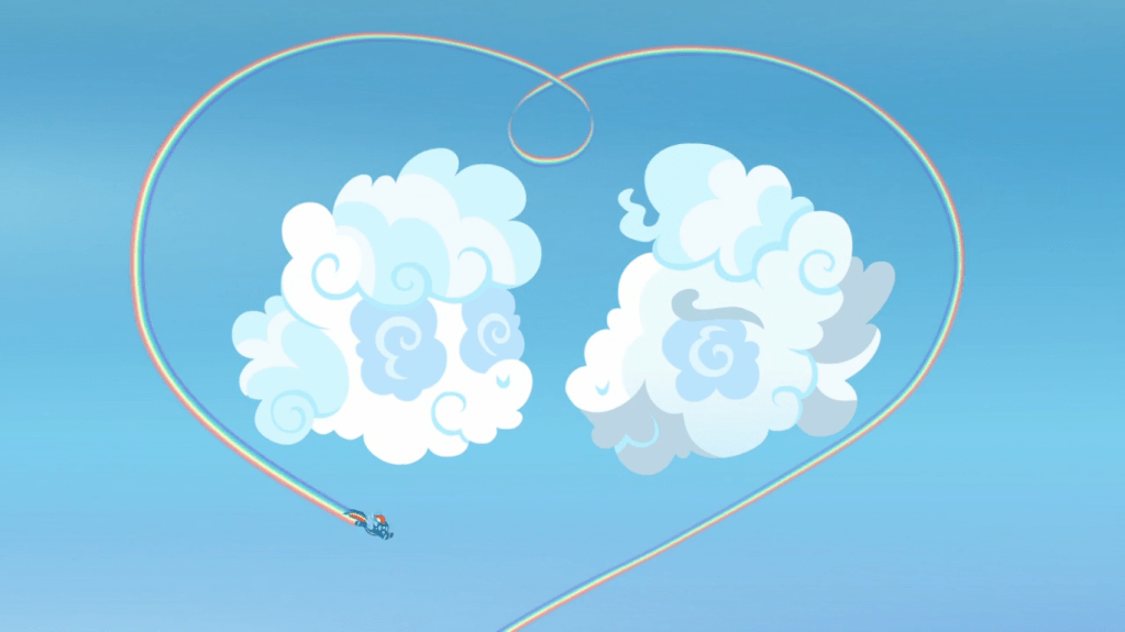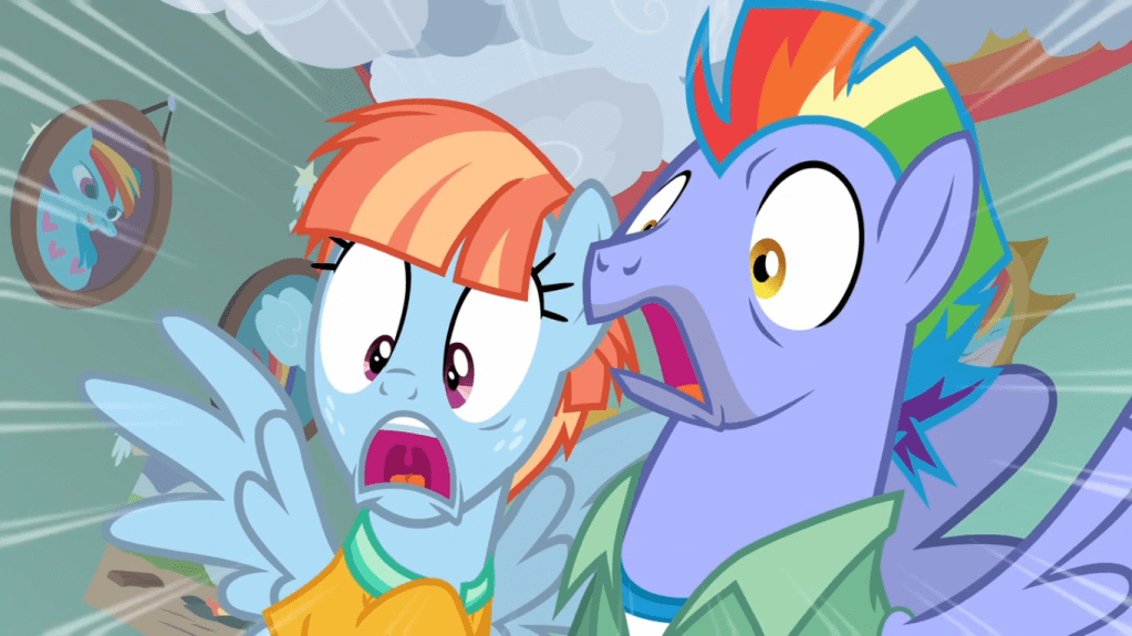 Rainbow Dash repeating the word “awesome” with no self-awareness is a perfect lapse of humor before her grand realization: she needs to do something to make it up to her parents. What she ends up doing is quite a sight.