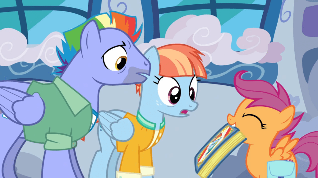 In the audience for a Wonderbolts show, Scootaloo recaps several episodes focusing on Rainbow Dash’s biography as a Wonderbolt. It turns out Rainbow Dash’s parents never knew their daughter even got into the Wonderbolts Academy, which was four seasons ago. If this doesn’t tell you how much of her life Rainbow Dash has been withholding from her parents, then I don’t know what does.
