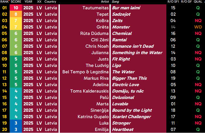 As you can see from my rankings, most of the songs in this national final weren’t great, but the ones I did enjoy I’m very happy I discovered. Even the songs I rated 6/10, I wouldn’t mind returning to now and then. And oh my god, I am so fucking happy about the song that won. I’m absolutely stoked for Latvian fans that they get to be represented by a native-language song for the first time since 2004.