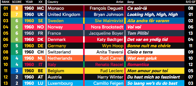 Once again there’s no interval act: Katie Boyle just gets on with the voting. The scoreboard has roughly the same layout as that of 1959, but it looks sleeker and less cluttered, and the country names are in English. I quite like how the font is compressed as needed so that no country or song takes up more than one line.