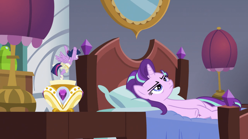 In the room Starlight is staying at, Twilight Sparkle uses a magic spell to appear in the form of a music box figurine. That would be the pony equivalent of her calling Starlight’s cell phone to see how she’s doing. Then Starlight displays an admirable moment of emotional intelligence: