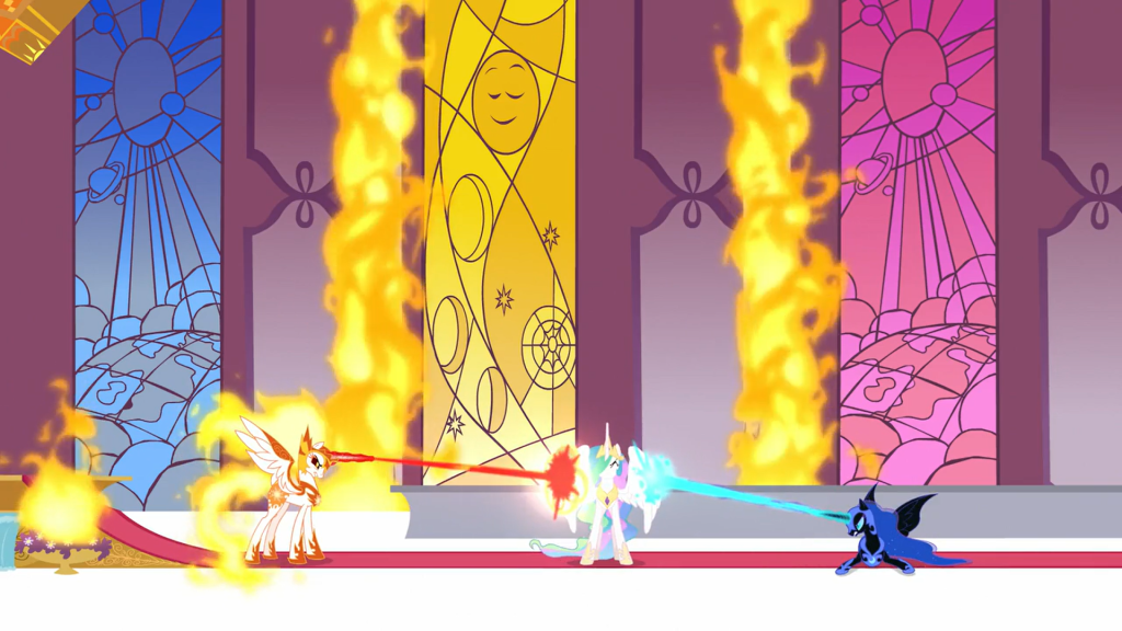 Celestia is being a total jerk to Luna right now, and in the context of this episode, that’s a very good thing. Everyone is a jerk to their siblings sometimes, especially if they’re the older sibling. And everyone likes to prove they’re the superior sibling sometimes, unless they’re an only child. I believe that every major or recurring character in any work of media should be a jerk at least once, because otherwise they wouldn’t be interesting characters. I wouldn’t love Twilight Sparkle this much if she wasn’t a jerk sometimes, and the same now goes for Celestia and Luna. Big Macintosh is a comparable example, since he’s also the oldest sibling: we got hints of him being a smug older sibling in Pinkie Apple Pie, then he was a total jerk to Applejack in Where the Apple Lies and it was glorious. Not because Applejack deserves to get bullied, but because it makes Big Mac a more interesting character.