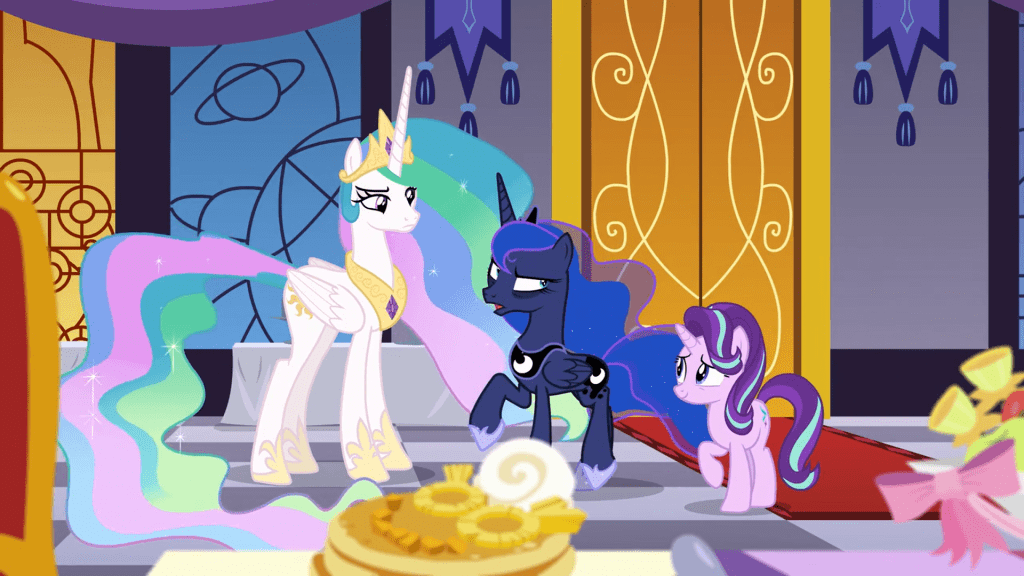 It’s a small touch, but I really love the way the animators made Celestia show a trace of disgust, then switch to a smile as quickly as possible. You can tell that she’s unusually good at putting on a smile, but you can also tell that she secretly found the pancakes disgusting. Luna and Celestia exchange some well-earned I-love-yous, then Starlight enters the scene.