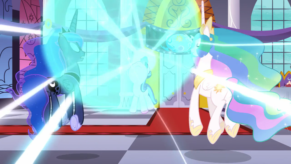 Premise: The Cutie Map sends Starlight Glimmer on a mission to Celestia and Luna’s castle because they haven’t been getting along as of late. To help them see eye to eye, she swaps the sisters’ cutie marks.