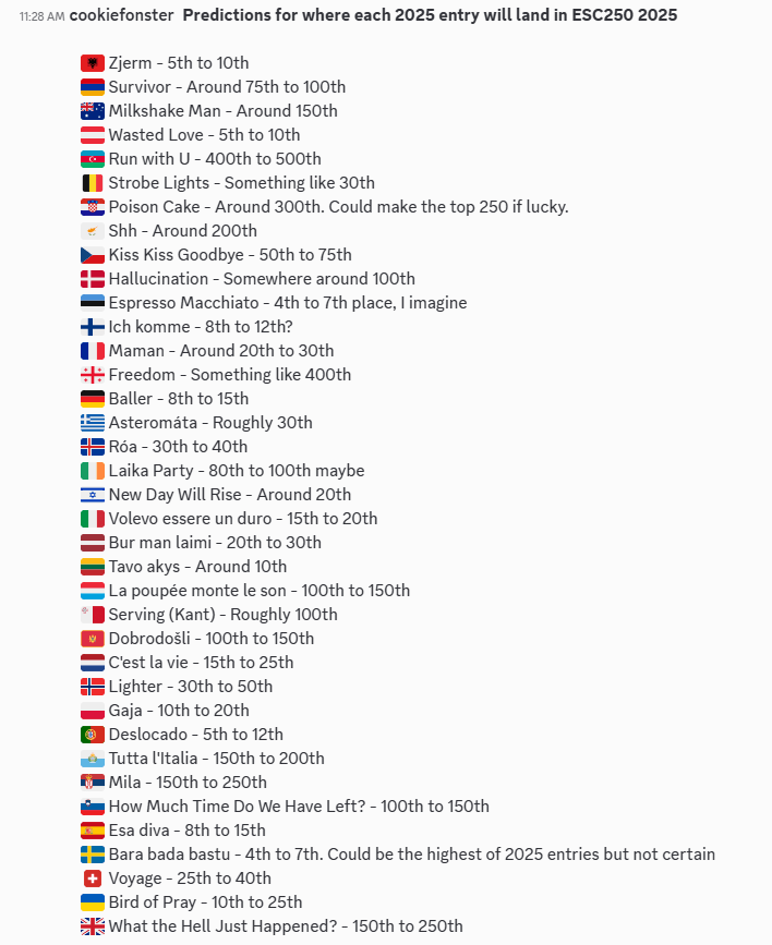 21: After writing my predictions list, I realized I had very few in the 50-100th place range, but didn’t feel like revising them. Next time I predict ESC250 results (if Eurovision isn’t fucking dead by then), I’ll try not to neglect that range. Norway, Lighter I had predicted to land 30th to 50th, so its end result of 98th place wasn’t too far off. Still, not quite correct.