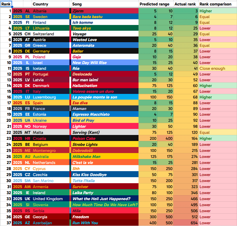 I overestimated most of these predictions, as you can see here. I got only six predictions correct, and that’s counting Iceland as close enough. I’ll go through these results bottom to top and discuss how well I did. Fun fact: 2023 had 26 out of 37 entries land in the top 250, 2024 had 29 out of 37 in the top 250, and 2025 had 25 out of 37 in the top 250. I’m referring to the respective ESC250 rankings for each year, just to be clear.