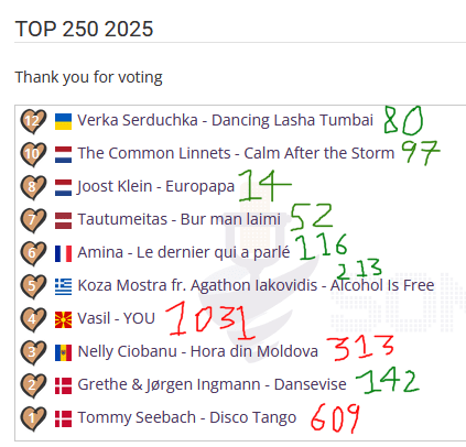 Happy new year, everyone! It’s still 2025 in Ohio as I’m writing this post, but not for much longer. I’ve decided to send off my blogging about Eurovision (for now) with something fun: an analysis of the results of the annual fan vote ESC250, specifically those for the entries of Basel 2025. The results were streamed on a French radio station on December 31, then once the stream ended the full results were published. Here are my votes with the position each song ended up in: