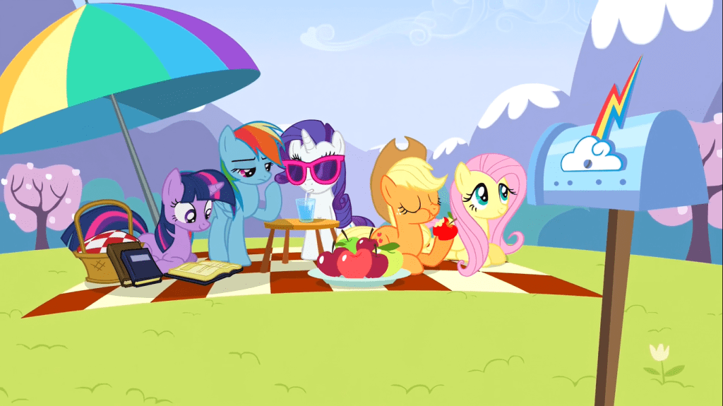 This episode starts with Applejack confidently waiting for apple bucking day to begin. The moment the sun rises, she gets right to it and bucks some apples, basking in their delight for a few seconds until they turn out to all be rotten and mushy. It turns out that the nasty vampire fruit bats have returned. The intro to this episode sets Applejack as the proud traditionalist who likes things the way they are, in contrast to Fluttershy who she gets into a moral debate with.