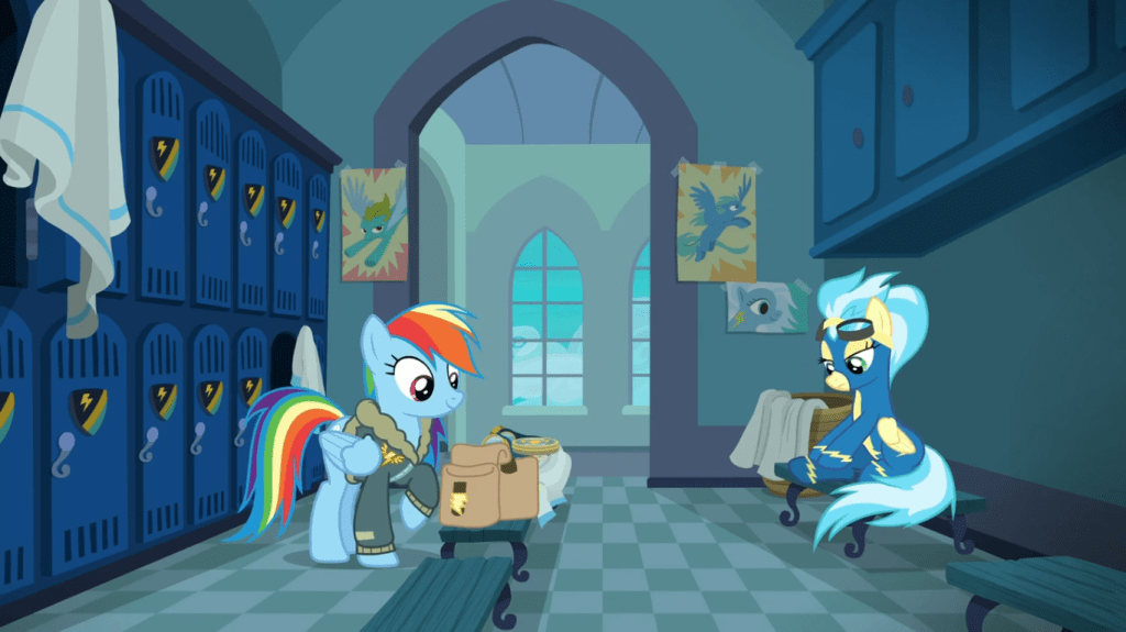 The start of this episode is a clever bait-and-switch. As she prepares to go back home, Rainbow Dash banters with her fellow Wonderbolts. Spitfire grumbles that she has to run trials week, then admits she loves putting on her aggressive act. This seems like it’ll just be a quick reminder that Rainbow Dash has fully established herself as a member of the group, making viewers think the rest of the episode will take place somewhere unrelated.