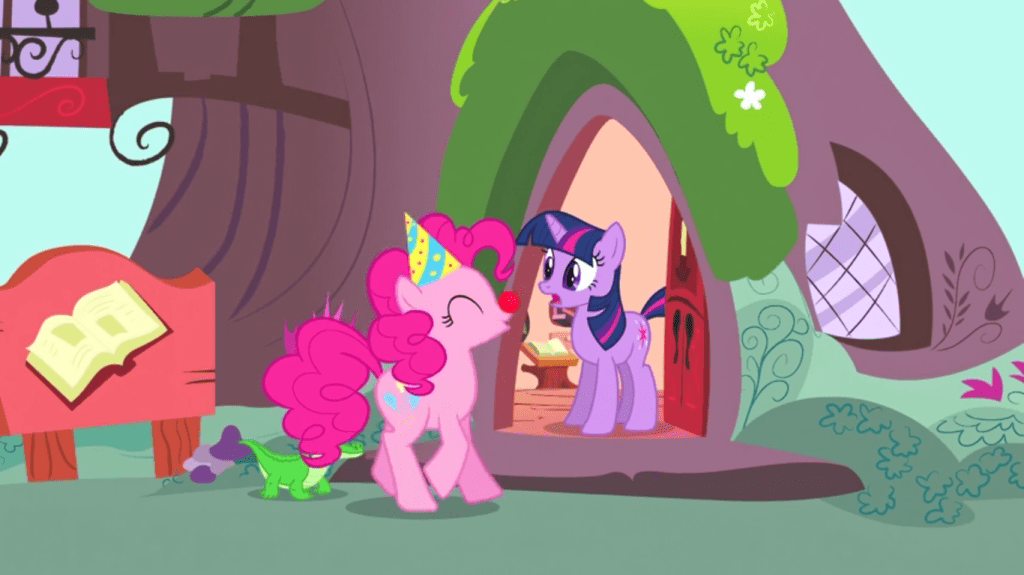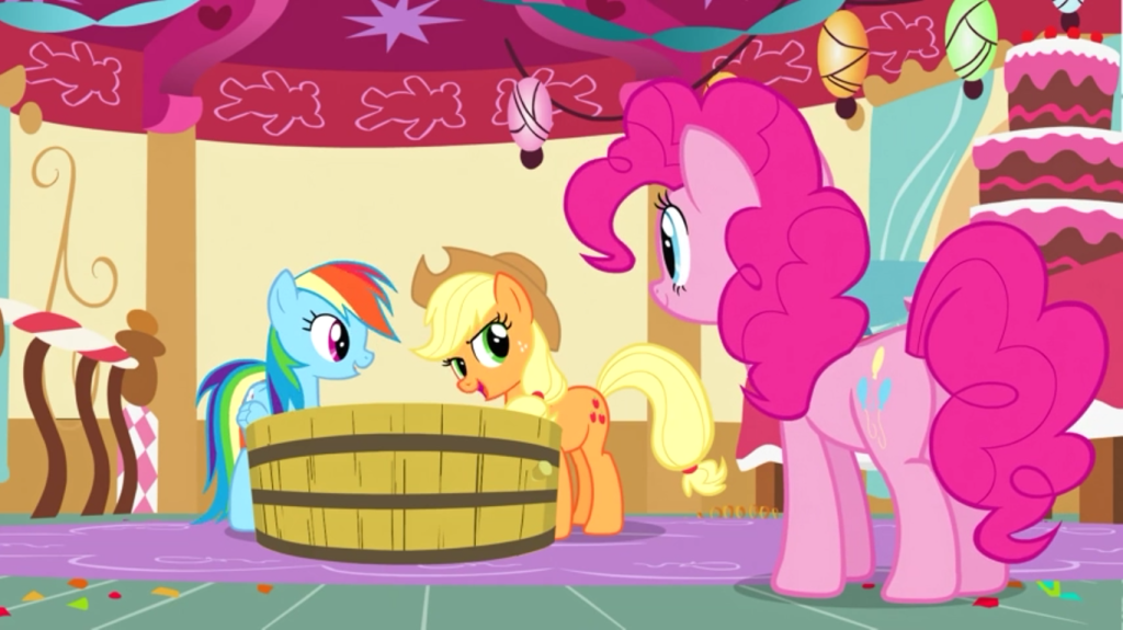 Rarity’s parents make their first (and only voiced) appearance in this episode, and all I can think about is how unlike every other member of the Mane 6, Rarity didn’t get an episode going in depth on her relationship with her parents. We just know them as parents who embarrass their elder daughter regularly and have far lower standards for food than her, while seeming to get along perfectly well with their younger daughter. They’re supposed to be Sweetie Belle’s regular caretakers until Rarity basically supersedes that role, meaning we don’t even get more scenes of Sweetie Belle interacting with their parents. Rarity’s parents just say they’re going on vacation for a week, leaving Sweetie Belle to stay with Rarity, and that’s all we hear from them.
