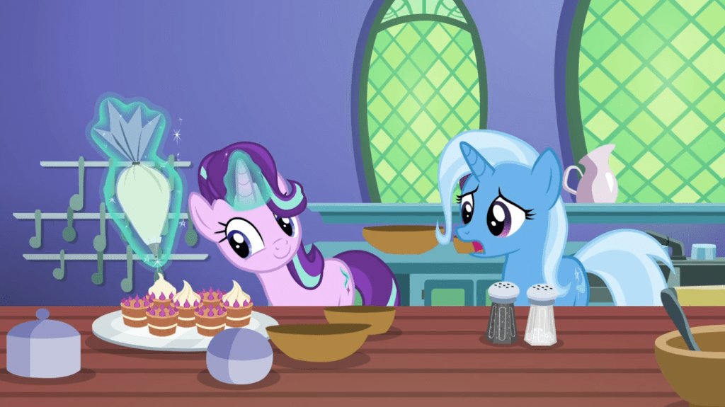 This episode begins with a slice of life scene featuring a fan favorite pair of characters, where Starlight Glimmer makes cupcakes for her friends’ trip and Trixie practices magic. When Starlight explains how to do a transfiguration spell and Trixie does it successfully, it first seems like happy fluffy friendship moments…